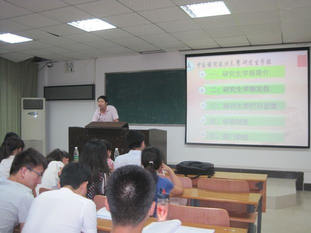 (学生记者 张景旭)2013年9月16日至18日,《中南财经政法大学研究生学报》(以下简称《研究生学报》)连续利用三个晚上时间、分场次在文添楼503教室召开了新生学术交流宣讲会?;嵋橛伞堆芯可Пā肪谩⒐芾砗头ㄑО婵楦敝鞅喾殖〈沃鞒?,党委研究生工作部白玉老师、石龙老师、《研究生学报》学生常务副主编石少剑博士和各学院研究生参加了本次活动。