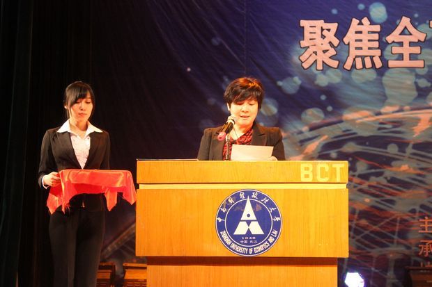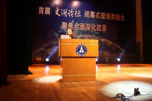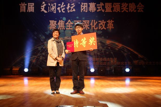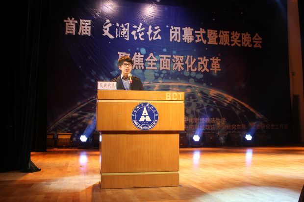 4月26日晚上7时,“文澜论坛”闭幕式暨颁奖晚会在我校大学生艺术体育活动中心音乐厅举行。副校长陈小君教授,学校各二级单位及职能部门负责人,“文澜论坛”评审委员会专家代表、70位参会代表、各研究生培养单位党委书记、分管研究生教育工作的院长、副院长,研究生院、研工部各副院长、副部长,各学院(中心)研究生工作办公室老师列席闭幕式,校研究生工作部副部长笪宁主持闭幕式?!拔睦铰厶场逼郎笪被嶂魅卫钚∑浇淌诰臀睦铰厶成蟾迩榭鼋辛俗芙岱⒀浴3滦【毙3?、研究生院唐国平常务副院长、党委研究生工作部周佳玲部长为35位获奖代表及优秀组织奖颁奖,特等奖获得者郗希作为获奖代表发言。在我校研究生会主席吴妍诗雨同学发言后,我校副校长陈小君教授为本届文澜论坛致闭幕辞。陈小君副校长认为本次论坛“是一场促进交流,强化学习,催人奋进的学术盛宴,是一场解放思想,继往开来,再创辉煌的思想盛会”。总结和运用好本次论坛的经验,对于今后稳步推进论坛建设具有重要的积极意义。至此,中南财经政法大学首届“文澜论坛”圆满落幕。