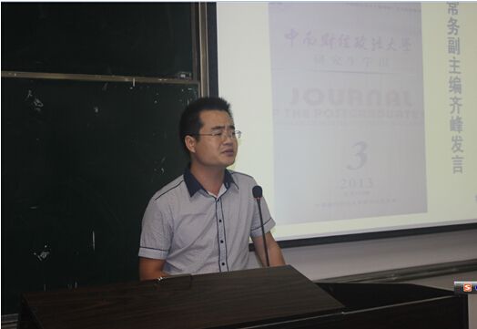 (学生记者 张楠)2014年9月18日晚,《中南财经政法大学研究生学报》(以下简称《研究生学报》)编辑部在文添楼102教室召开了办学年首场招新宣讲会。《研究生学报》常务副总编齐峰博士、各版块副主编及各部门部长出席了本次宣讲会,宣讲会由宣传部部长张楠主持。