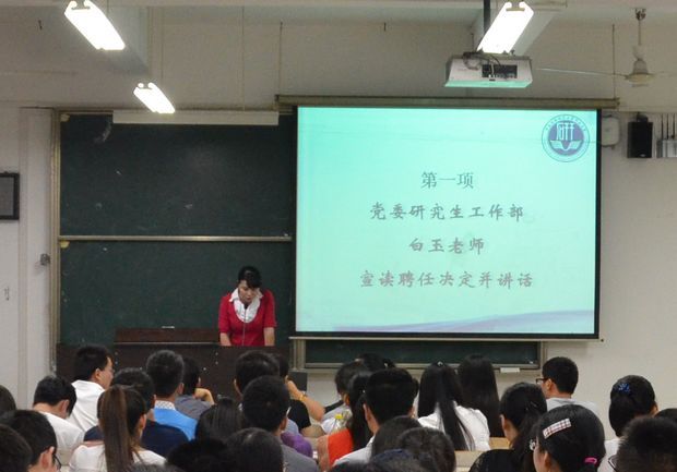 大会伊始,白玉老师代表研究生院、党委研究生工作部和研究生团委宣读了中南财经政法大学第三十届研究生会、第二届《中南研语》编委会的聘任决定。随后,白玉老师对全体同学在未来一年的工作提出了三点要求:一是,乐于奉献,不谋私利;二是,精诚合作,团结友爱;三是,明确职责,找准定位。她希望同学们在工作中努力打造精品活动,在为广大同学做好服务的同时,自己也能收获友谊,展示才华,提升能力。