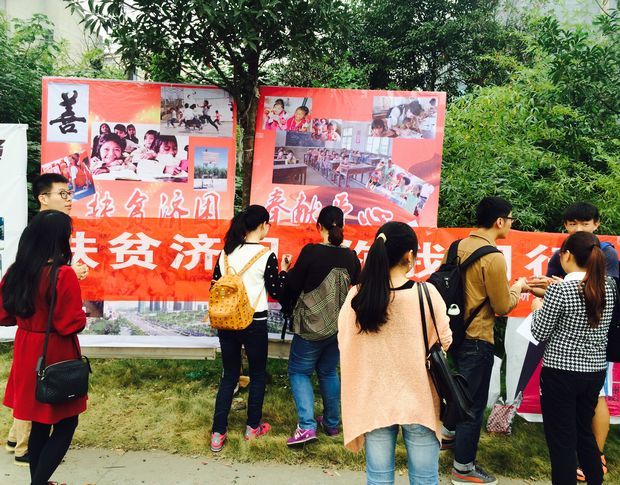 在宣传图片的展板上,贫困地区学生们天真可爱的笑脸、渴望知识的眼睛与背后残破的课桌、破旧的书本、恶劣的教学环境形成了鲜明的对比。“经过这次主题活动,我才知道原来全国各地有这么多的贫困地区还需要我们出一份力?!苯鹑谘г旱奈馔钋榈厮档馈!拔乙彩且幻独?,所以我感同身受,同时我自己也会竭尽所能帮助其他贫困地区的同学?!本醚г旱恼磐б灿兴械厮档?。