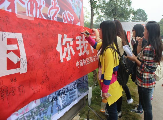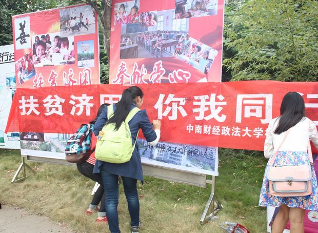 (学生记者 夏雨龙 吴迪 易杰 )2014年8月1日,《国务院关于同意设立“扶贫日”的批复》明确规定,自2014年起,将每年的10月17日设立为扶贫日。为贯彻落实国务院扶贫办开发领导小组制定的《2014年教育系统扶贫日活动方案》,我校制定了《中南财经政法大学2014年扶贫日活动方案》。根据相关方案要求,中南财经政法大学研究生会于10月17日中午在校南湖校区五羊广场开展了“扶贫日”主题图片展宣传教育活动。同学们积极参与,纷纷在宣传横幅上留下自己的签名,此次活动取得了良好的效果。
