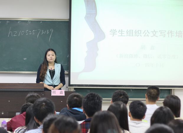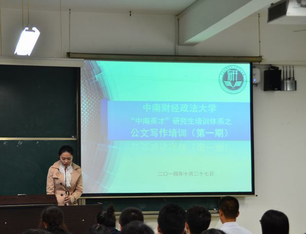 (学生记者 韩旭 李梦蝶 周志源 尹群峰)10月27日晚7时,由第三十届校研究生会秘书处主办的“中南英才”研究生培训体系之公文写作培训在文添105教室举办。培训邀请了校团委学生副书记胡鑫作为主讲人。校研究生会主席雍华、秘书长李倩雯、副主席王倩及全体实习干部、第二届《中南研语》编委会成员、第三十一届《中南财经政法大学研究生学报》编委会成员、各学院研究生干部代表参加了本次培训。