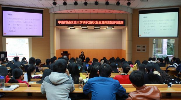 (学生记者 王倩 张坤 杨孟夏 廖归)11月20日下午,主题为“我的未来我做主”的研究生职业生涯规划讲座在文潭楼一楼报告厅成功举办。中南财经政法大学工商管理学院王淑红副教授担任本次讲座主讲嘉宾,研究生思政教育办公室主任白玉老师出席了讲座,讲座由校研究生会主席雍华主持。