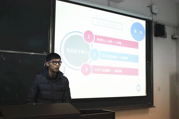 在“优秀论文展示”环节中,三位展示者分别为会计学院2013级硕士刘巍、法学院2012级硕士张晓萌、统计与数学学院2013级硕士魏国栋,他们分别为“管理与人文”、“法学与政治”、“经济与金融”三大版块的优秀论文代表。在讲述完自己所发表文章的写作灵感、选题、写作方法与角度后,他们又分别根据自己的专业特点,从论文选题、案例充实、实证逻辑等方面为大家分享了自己的写作心得。