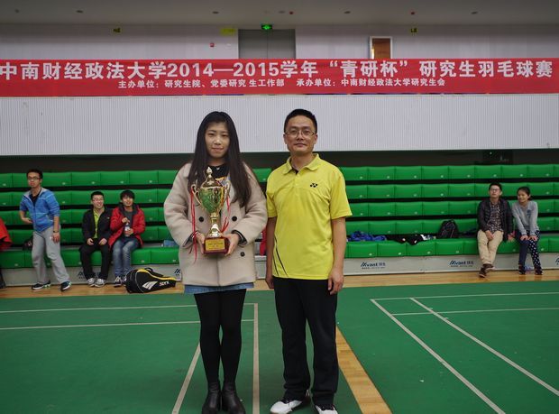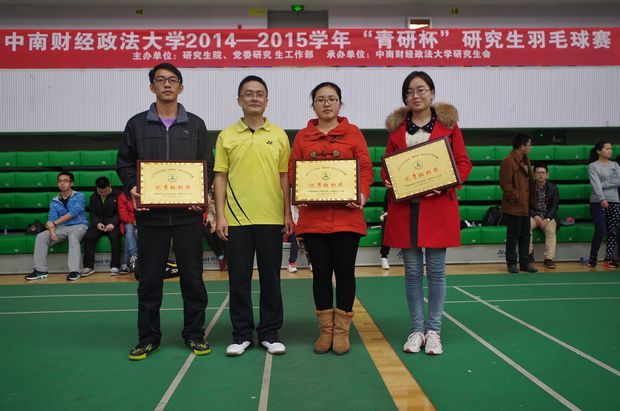 (学生记者 韩旭 谢东飏)3月21—22日,由我校研究生院、党委研究生工作部主办,校研究生会承办的中南财经政法大学2014—2015学年“青研杯”研究生羽毛球赛在艺体中心成功举办。党委研究生工作部笪宁副部长莅临本次比赛,并为获奖选手颁奖。