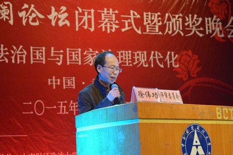 在主论坛报告阶段,我校吴汉东教授从国家治理的政治维度、国家治理的政治向度、国家法治体系构成、国家治理主体能力建设等角度详细阐述了“国家治理现代化与法治化的中国道路”这一主题。 湖北经济学院院长吕忠梅教授从我国生态现状入手,就生态文明与法治间的关系,生态文明建设的法治道路、法治路径、制度建设等角度阐述了“生态文明建设的法治路径选择”这一主题。山东莱芜钢铁集团有限公司副总经理董立志以“全面推进‘法治莱钢’建设,率先打造依法治企‘升级版’”为题,介绍了“法治莱钢”的八法理念、六维创新及主要成效。