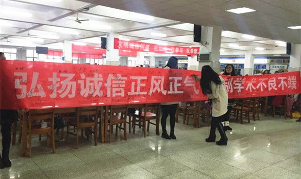 (通讯员 许一平)为了进一步促进学风建设,营造严谨踏实、奋发向上的学习氛围和良好的学术环境。2015年12月24日中午,由研究生院、党委研究生工作部主办,新闻与文化传播学院和信息与安全工程学院共同承办的“科学道德与学风建设”签名活动在我校学生十食堂顺利举行。