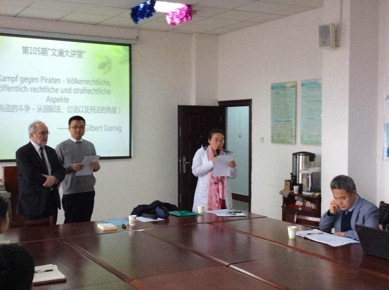 ?。ㄍㄑ对?nbsp;赵娜 袁珊珊 赵今)为拓宽广大研究生学术研究的视角,提高在校研究生学术研究的平台,2015年3月23日下午,由研究生院、党委研究生工作部主办、刑事司法学院承办的第105期“文澜大讲堂”在文治楼二楼会议室正式拉开帷幕。本次讲座邀请了来自德国马尔堡大学的Gilbert Gornig教授,刑事司法学院副院长苏彩霞教授、副院长童德华教授分别作为主持人和嘉宾莅临本场讲座,青年教师张正宇老师实时翻译。