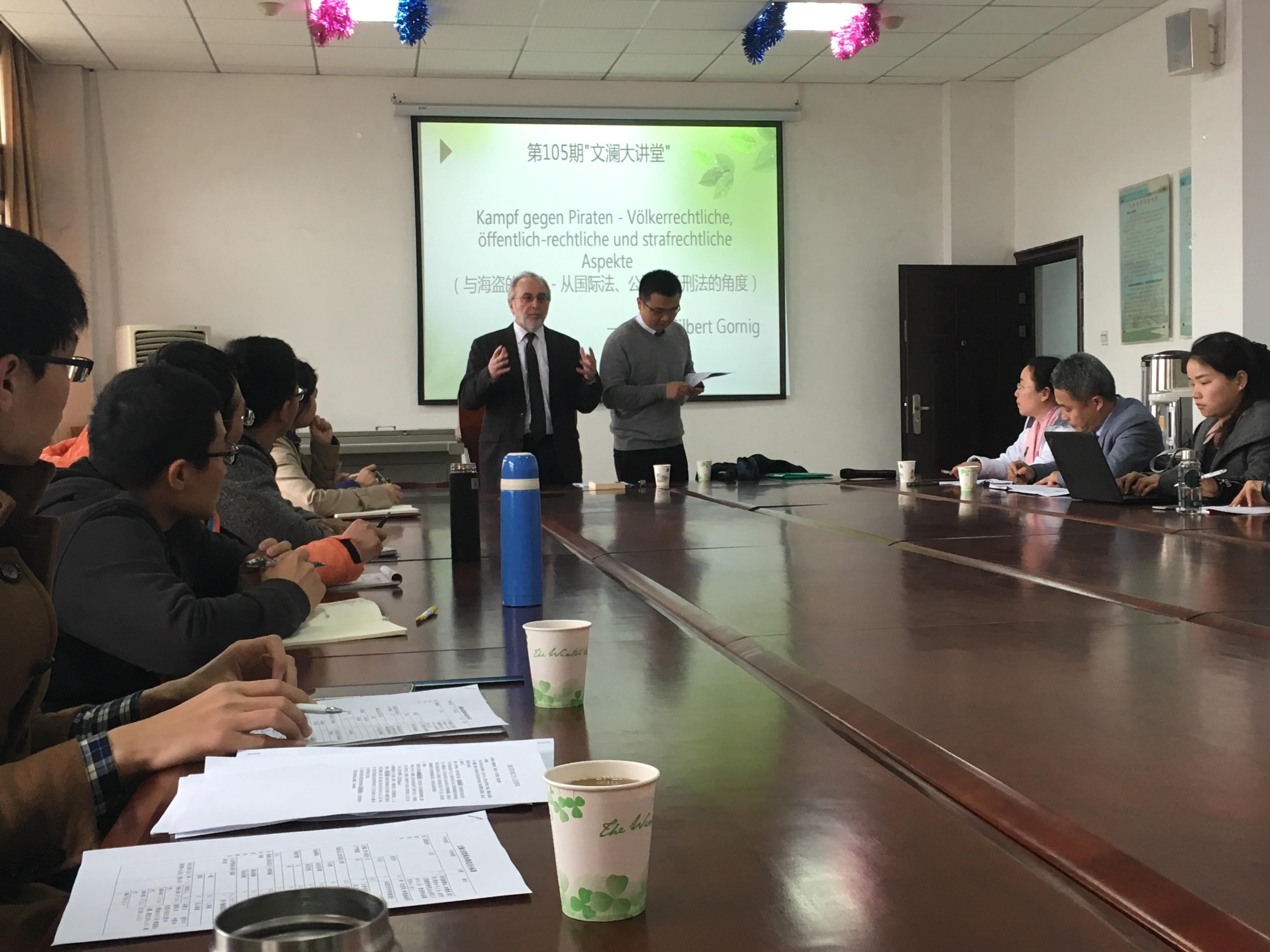 ?。ㄍㄑ对?nbsp;赵娜 袁珊珊 赵今)为拓宽广大研究生学术研究的视角,提高在校研究生学术研究的平台,2015年3月23日下午,由研究生院、党委研究生工作部主办、刑事司法学院承办的第105期“文澜大讲堂”在文治楼二楼会议室正式拉开帷幕。本次讲座邀请了来自德国马尔堡大学的Gilbert Gornig教授,刑事司法学院副院长苏彩霞教授、副院长童德华教授分别作为主持人和嘉宾莅临本场讲座,青年教师张正宇老师实时翻译。