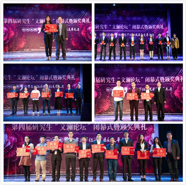 本届论坛评审委员会委员、中南财经政法大学工商管理学院石军伟教授就论坛审稿情况进行了总结发言。研究生院副院长袁桂君、校团委副书记梁娜、科学研究部副部长张志刚、研究生院院长胡立君、党委宣传部部长殷修林、副校长邹进文等领导为35位获奖代表及优秀组织奖颁奖。一等奖获得者刘晨跃同学、校研究生会主席张翀同学发言后,副校长邹进文教授为本届论坛致闭幕辞,他建议青年学子要审时度势,强化革新意识;百家争鸣,推进学术交流;求真务实,聚焦论坛实效。邹校长指出,要以本届论坛的成功举办为契机,探求行之有效的社会发展之道,在变中求新,在新中求进,在进中突破,努力开创学术发展的新局面,促进学术文化的繁荣昌盛。