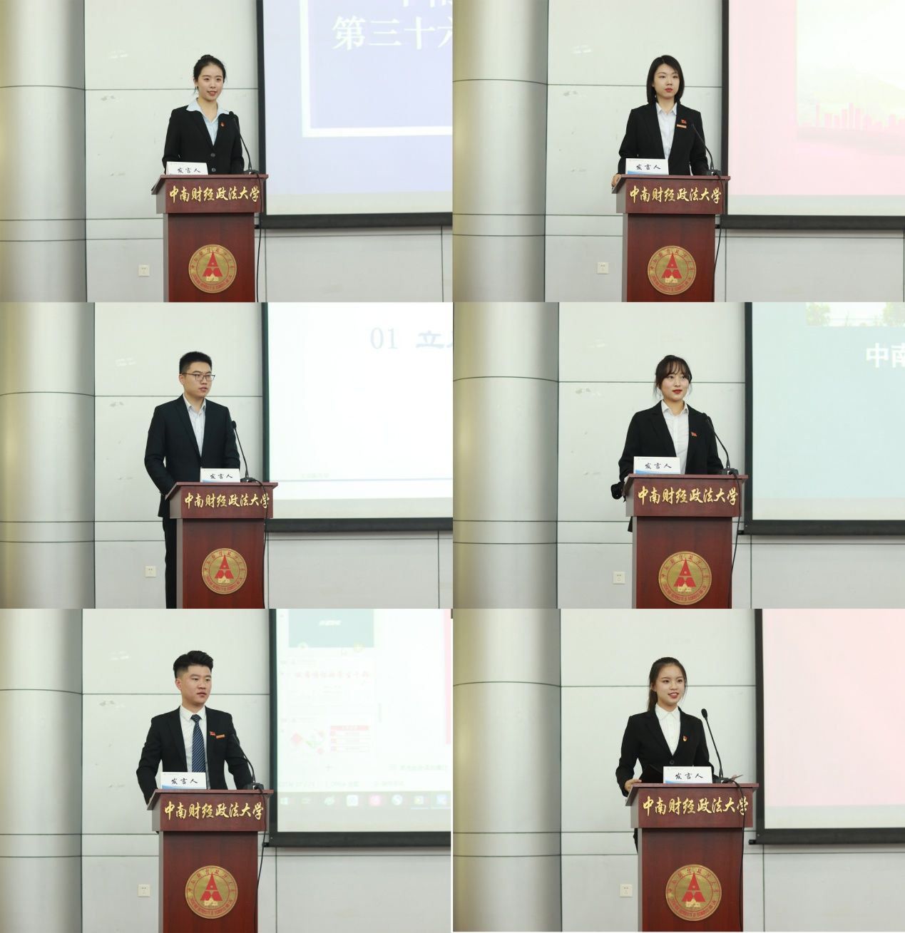 最后进行大会第二次全体会议暨闭幕式,大会审议表决《中南财经政法大学第三十六届研究生会主席团选举办法》。主持人对候选人提名情况进行说明后,6位候选人依次就自身经历、竞选优势、工作规划等进行了3分钟的竞选演讲。