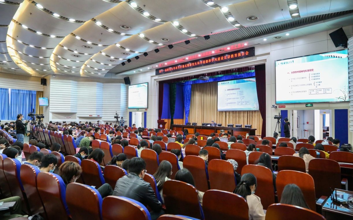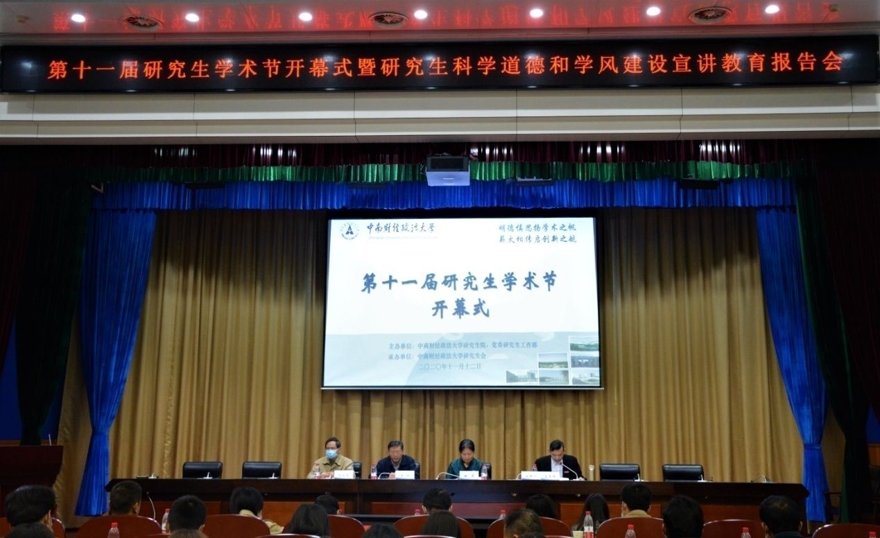 (通讯员 付慧娟 黄丽琼 徐晨 肖张薇 王婵媛)11月12日上午9时,我校第十一届研究生学术节开幕式暨研究生科学道德和学风建设宣讲教育报告会在文泉楼学术报告厅隆重举行,并同步进行线上直播。校党委常委、副校长覃红教授,校党委常委、副校长姚莉教授出席开幕式,党委宣传部、科学研究部、校团委、研究生院、党委研究生工作部负责人,全校17个研究生培养单位的党委书记、分管研究生培养的院长、副院长、研究生工作办公室老师以及华中地区兄弟高校的研究生代表和我校研究生代表参加了开幕式??皇接傻澄芯可ぷ鞑坎砍ばご湎橹鞒?。