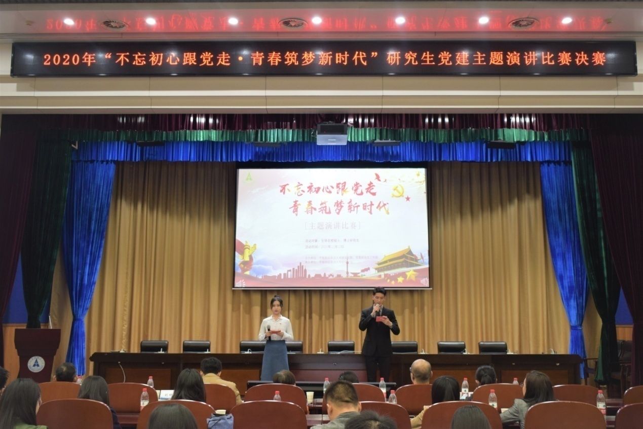 (通讯员 付慧娟 黄丽琼 管西菊 李琪 赵鑫)在全面建成小康社会,实现第一个百年奋斗目标之际,为进一步学习贯彻习近平新时代中国特色社会主义思想、党的十九大精神及十九届历次全会精神,深入开展“四史”、疫情防控学习教育,展现研究生群体奋发向上的精神风貌,党委研究生工作部特面向全体研究生举办了“不忘初心跟党走?青春筑梦新时代”党建主题演讲比赛。经过初赛推选和复赛选拔,演讲比赛决赛于11月12日下午2点30分在文泉楼报告厅拉开帷幕。校党委常委、党委组织部部长兼统战部部长刘琳琳,党委研究生工作部部长肖翠祥出席。新闻与文化传播学院吴玉兰教授、党委宣传部副部长徐江、党委组织部副部长陈金川、研究生院副院长王广波、校团委办公室主任张艳芸老师担任评委。比赛由党委研究生工作部副部长雷磊主持。