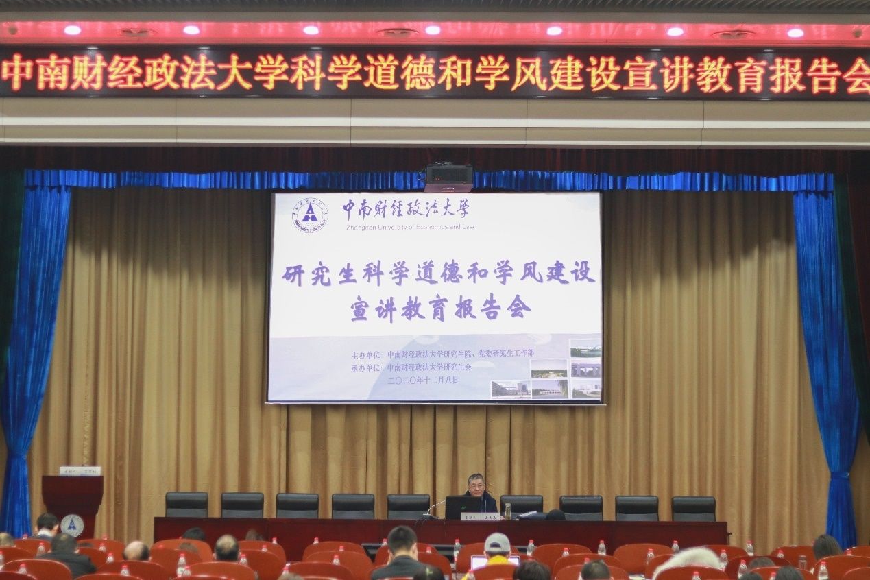 (通讯员 付慧娟 黄丽琼 毛姜娜 陈谦 赵鑫)2020128日下午2点半,由研究生院、党委研究生工作部主办,校研究生会承办的2020年科学道德和学风建设宣讲教育专题报告会在文泉楼报告厅成功举办。受校党委常委、副校长姚莉教授的邀请,中南财经政法大学哲学院院长、博士生导师王雨辰教授就“科研道德与学风建设”这一主题做报告。各研究生培养单位分管研究生教育工作的院长(副院长)、分管研究生思政工作的书记(副书记)、2019年新聘博导、2020年新聘硕导、研究生辅导员以及各学院(中心)研究生代表参加了此次报告会。报告会由党委研究生工作部部长肖翠祥主持。