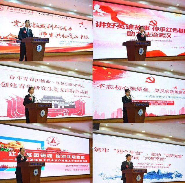围绕落实党建工作重点任务和实施“对标争先”建设计划,切实加强研究生党支部标准化规范化建设,我校于今年年初伊始开展了2020 年研究生样板党支部创建项目培育工作。经研究生各党支部申报、各学院(中心)党委(党总支)遴选推荐、学校组织评审,于六月确定《党建激发科研活力,师生共助疫后重振》等10个项目为2020年研究生样板党支部培育项目;《讲好英雄故事,传承红色基因,助力法治武汉》等10个项目为2020年研究生样板党支部培育后备项目。各研究生党支部严格对照立项要求和立项方案,认真组织实施项目方案。经过为期半年的建设期后,于12月初开展项目结项验收工作。在此次成果展评中,20个研究生党支部就本支部培育项目的建设过程、建设成效、特色活动、创新之处、经验与不足等进行展示汇报,充分展现了我校研究生基层党建工作的精神风貌。