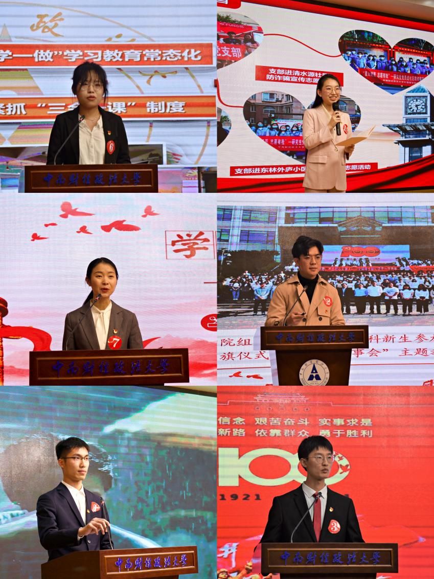 经过评选,2020级统计与数学学院学硕党支部和外国语学院2020级研究生党支部部荣获一等奖;工商管理学院硕士研究生2019级党总支、文澜学院研究生第一党支部、法学院研究生2020级民商法学党支部和信息与安全工程学院研究生党支部荣获二等奖;新闻与文化传播学院2020级研究生党支部、经济学院2020级研究生党支部、公共管理学院研究生2002党支部、刑事司法学院硕士生2020级刑法学党支部、财政税务学院2020级硕士研究生党支部和法律硕士教育中心2004班学生党支部获得三等奖。领导嘉宾们分别为获奖支部颁奖并合影留念。