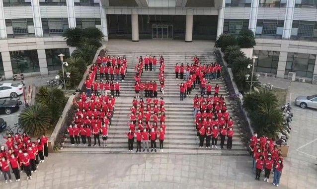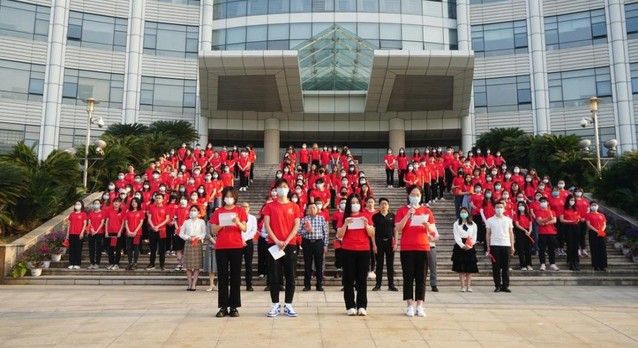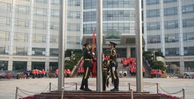 旭日东升,学生们穿着整齐划一的红色T恤,手持国旗,在台阶上列队站成二十大造型,象征对中共二十大即将召开的美好祝福。早七点,升旗仪式正式开始,国旗护卫队队员们迈着整齐而坚定的步伐护送国旗入场。伴随着庄严激昂的国歌声,鲜艳的五星红旗在习习晨风中冉冉升起,全体师生庄严肃立,高唱国歌,向国旗行注目礼。