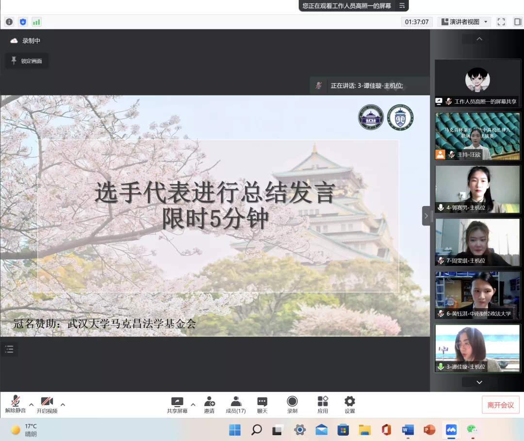 本次比赛采取线上方式进行,初赛采用简历筛选的方式进行,选取前20名选手晋级复赛,复赛包括自我展示、观点阐述和无领导小组讨论三个环节,分为法检组、法务组和律所组,选手分别以自身的职业定位为依托,围绕各自赛道的实务案例进行观点阐述和无领导小组讨论,根据综合成绩选取前6名同学晋级决赛;决赛采取集体专业答辩的方式进行,评审为法检工作人员、律所合伙人以及企业高管。在复赛和决赛中,周逸博凭借扎实的专业功底、快速的临场反应能力以及优秀的逻辑和表达能力,充分展现出了我校法学研究生的专业素养和高水平的职业素质,体现了法硕学生的优良精神风貌和较高的专业水准,最终斩获大赛季军。