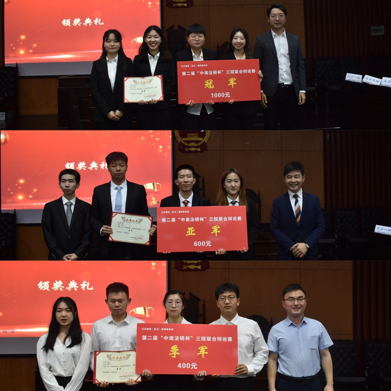 最终,经评委评议,“打怪升级发财队”荣获本届“中南法研杯”三院联合辩论赛冠军,“你们说的都队”荣获亚军,“放我们一马队”荣获季军,冯扬哲、苑淑琦等七位选手获得本届比赛“最佳辩手”称号。评委嘉宾为冠亚季军、最佳辩手颁奖,并合影留念。