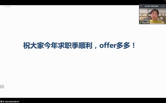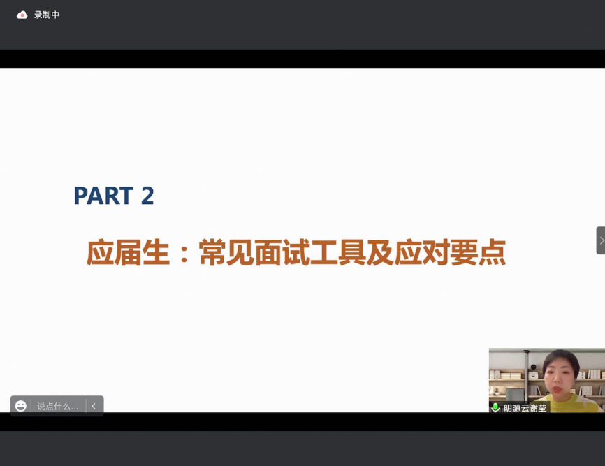 在应届生面试指导方面,谢莹老师从BEI面试方法引入,介绍了企业普遍运用的面试工具,丰富了同学们对企业考察过程的认知。随后,她分结构探讨了面试过程中的常见问题,逐一进行深入剖析并提供应对建议。最后,谢老师深入介绍了面试前的必要准备与面试过程中的贴切表达,针对面试环节进行要点提炼,为同学们未来的面试表现打下了牢固的基础。