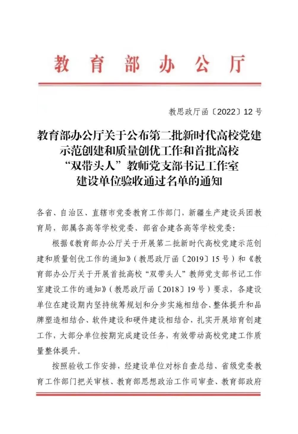 据悉,第二批新时代高校党建示范创建和质量创优工作共遴选10个高校党委、99个院系党组织、999个党支部分别作为全国党建工作示范高校、标杆院系、样板支部培育创建单位。此次,教育部办公厅共认定9个高校党委、98个院系党组织、990个党支部通过验收。首批新时代高校党建示范创建和质量创优工作延长建设期的1个院系党组织、1个党支部经二次验收,予以通过。