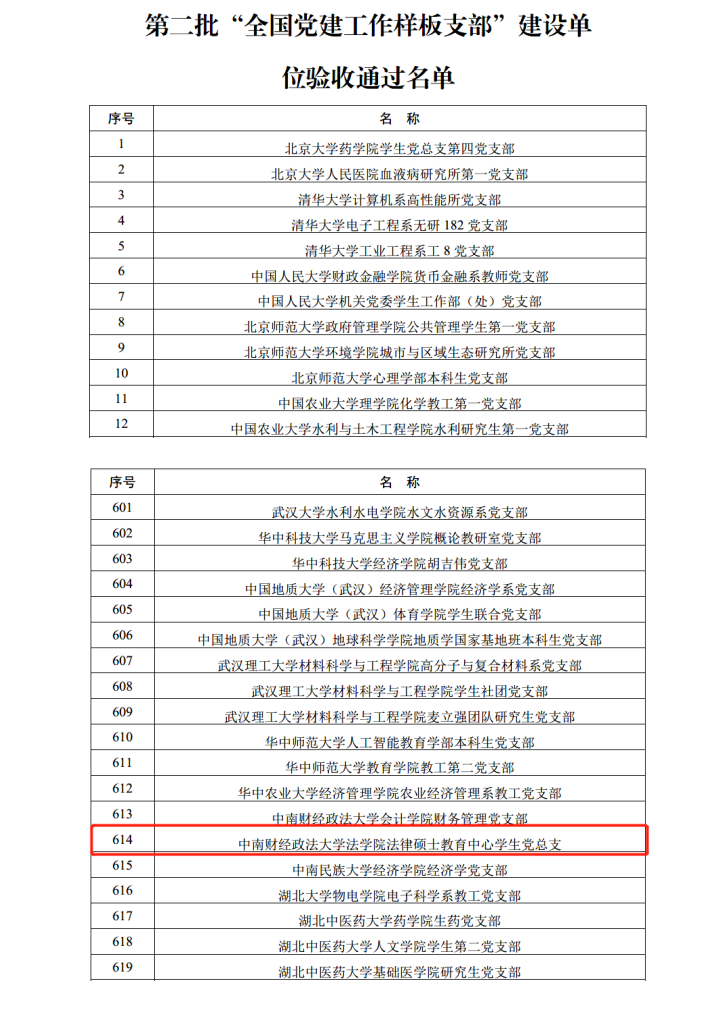 日前,教育部办公厅公布第二批新时代高校党建示范创建和质量创优工作和首批高校“双带头人”教师党支部书记工作室建设单位验收通过名单。经建设单位对标自查总结、省级党委教育工作部门把关审核、教育部思想政治工作司审查,法律硕士教育中心学生党总支顺利通过第二批“全国党建工作样板支部”验收。
