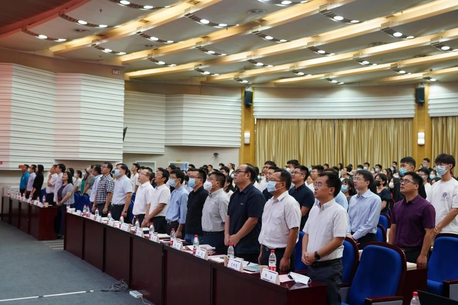 典礼正式开始,全体起立,奏唱国歌。