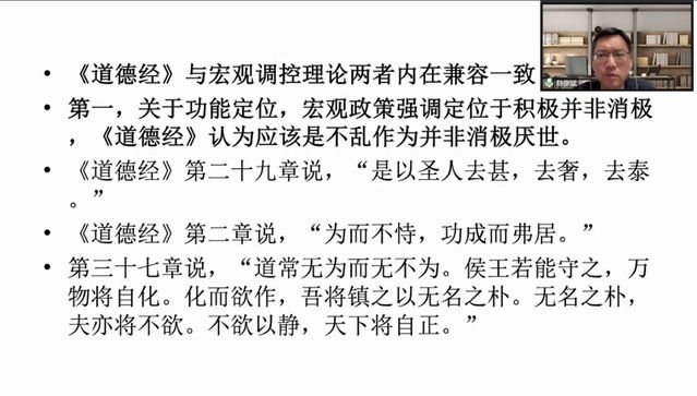 随后,陈彦斌教授提出了中国特色宏观调控改革总体思路的两大原则,一要通过吸收中华传统文化来强调中国特色宏观调控的“中国特色”,二要通过构建宏观政策三策合一理论框架来强调中国特色宏观调控的“一般性”,并进一步引出了中华优秀传统文化和人类文明的瑰宝——《道德经》。