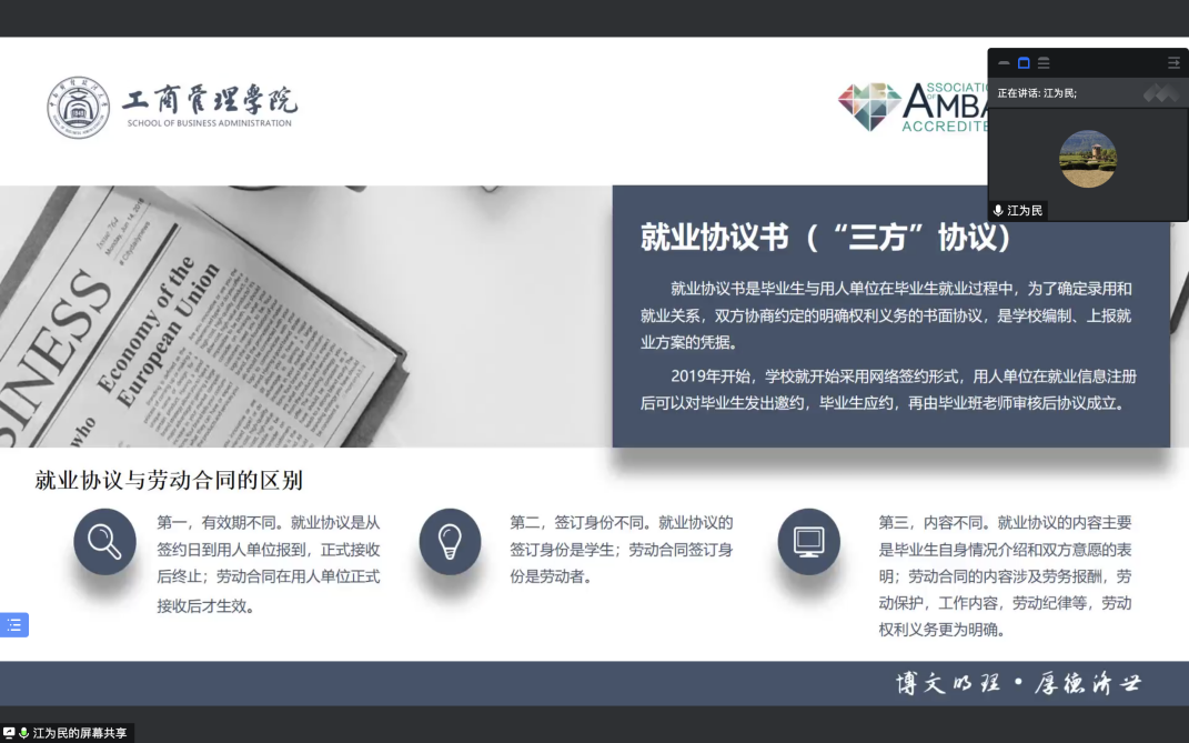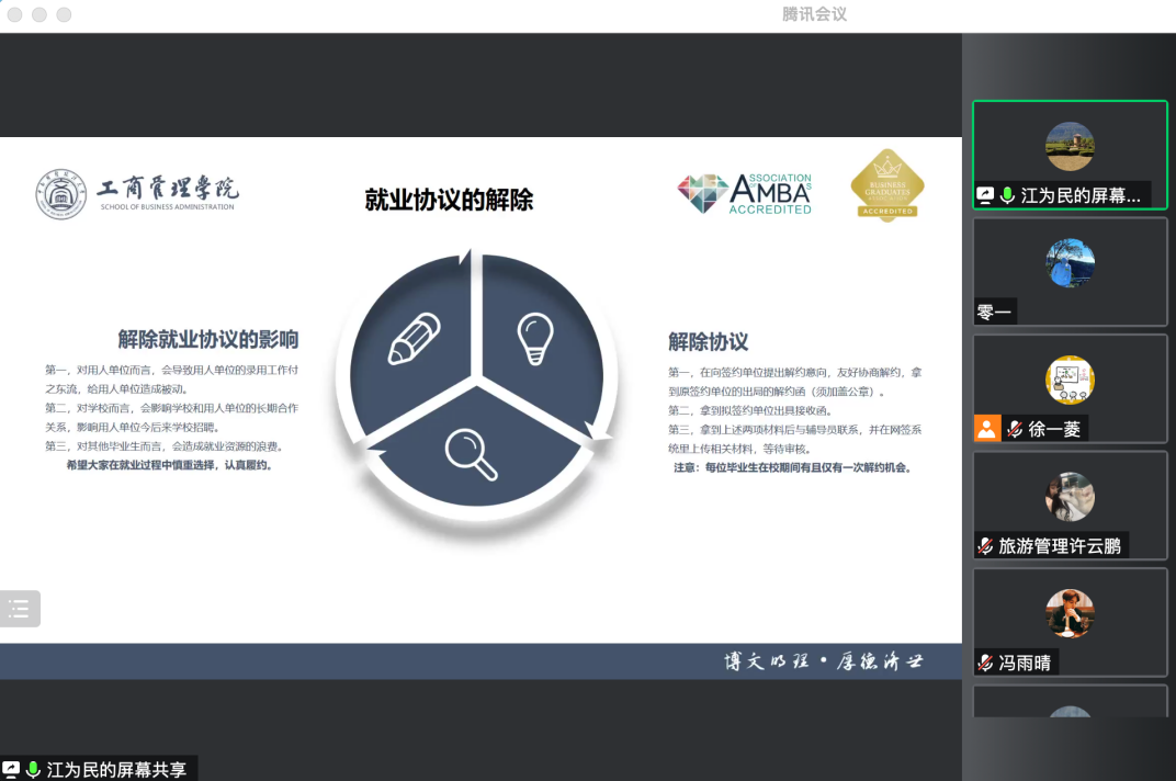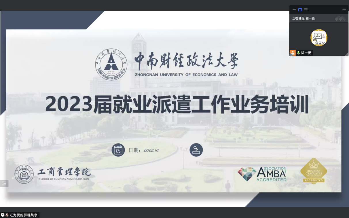 (通讯员:谢灵依)为了更好地帮助2023届毕业生了解就业协议签订规范,掌握毕业生档案派遣要求、户口迁移流程和相关就业政策,正确操作网签就业系统,工商管理学院于2022年10月6日在腾讯会议成功举办了2023届毕业生就业派遣暨网签培训会,此次培训由研究生辅导员江为民老师与徐一菱老师主讲,学院2023届全体毕业研究生参加。