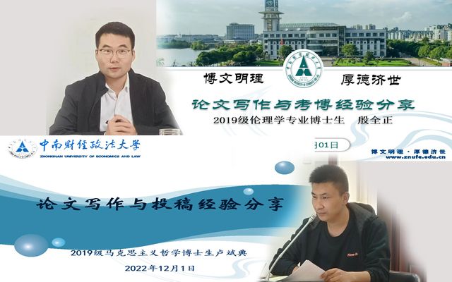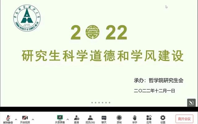 (通讯员 王路芳 李敏)为进一步加强我院研究生科学道德和学风规范建设,积极营造中南大良好科研生态和氛围,2022年12月1日晚7:15,由我校研究生院、党委研究生工作部和校研究生会主办,哲学院承办的“科学道德和学风道德建设宣讲教育”在线上腾讯会议成功举办。本次活动邀请2019级伦理学专业博士研究生殷全正和2019级马克思主义哲学专业博士研究生卢斌典进行分享,辅导员王路芳、学院2021级和2022级全体硕士研究生参加。