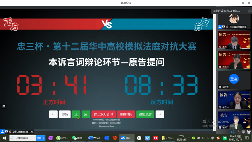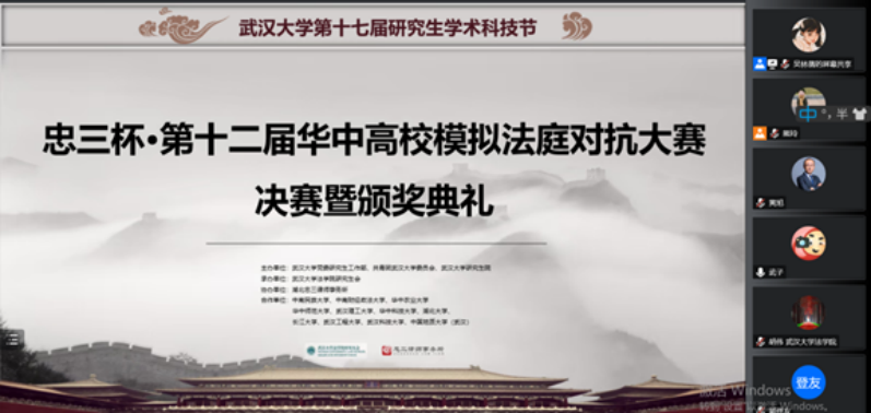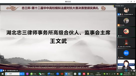 (通讯员 张秋蕊 蔡晓)12月11日18点30分,“忠三杯”第十二届华中高校模拟法庭对抗大赛决赛在腾讯会议线上正式举行。中南财经政法大学代表队在过去的一个多月里,经过初赛与复赛的激烈角逐,一路过关斩将,凭借优秀的赛场表现从众多高校队伍中脱颖而出,与中南民族大学代表队会师珞珈进行决赛比拼。本次比赛,双方针对“原告陈浩诉被告王瑞返还房屋装修不当得利案”展开精彩绝伦的交锋对抗,最终中南财经政法大学代表队以更为优异的表现斩获冠军!
