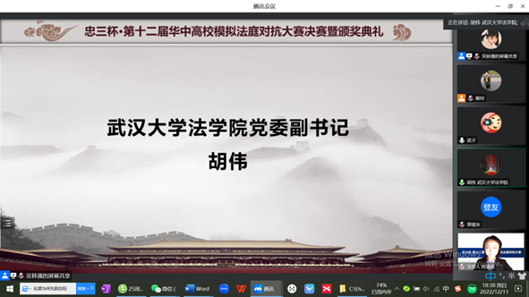 比赛开始前,武汉大学法学院党委副书记胡伟代表武汉大学法学院致辞,对莅临本次比赛的评委和嘉宾致以谢意,对两支决赛的参赛队伍表示热烈祝贺。并且指出华中高校模拟法庭竞赛有利于强化学生的法治思维、提升实践运用能力,以培养担当民族复兴大任的新时代法治人才?;懈咝DD夥ㄍサ乃忱侔炖氩豢敝胰墒κ挛袼曰械厍迫瞬排嘌墓刈⒑椭С?,以及法检律师系统各位同仁们的广泛关注,华中各兄弟院校的积极参与、老师们的悉心指导和同学们的认真准备。