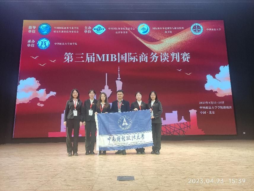 (通讯员 朱佳怡)2023年4月22-23日,第三届MIB国际商务谈判赛复赛在北京正式开赛。本届大赛由全国国际商务专业学位研究生教育指导委员会作为指导单位,中国国际贸易促进委员会法律事务部、国际商事争端预防与解决组织秘书处和中国政法大学联合主办。我院2022级国际商务、国际贸易专业硕士研究生余姝婷、曲俞柯、张亦珑、张嘉欣和朱佳怡同学组成的代表队在工商管理学院经济贸易系刘凯副教授和张华容教授的共同指导下,经过数月的紧张备赛和两天的激烈角逐,最终代表队荣获本次大赛团队三等奖,刘凯老师荣获“优秀指导老师”荣誉称号。