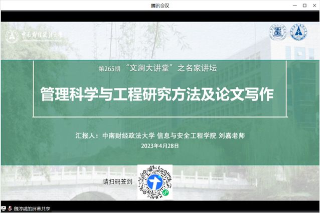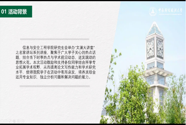 (通讯员:李必成 王婵婵 汤小林)为营造我院良好的学术环境,深化教育效果,鼓励和支持我院研究生结合所学专业拓展学术视野,提高论文写作能力和学术研究水平。2023年4月28日晚上18:30由中南财经政法大学研究生院、党委研究生工作部和中南财经政法大学研究生会主办,信息与安全工程学院研究生会承办的“文澜大讲堂”之名家讲坛在线上腾讯会议成功举办。