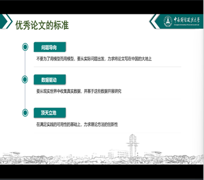 其次,刘嘉老师对优秀论文的标准进行了介绍。介绍了“问题导向、数据驱动、顶天立地”十二字标准。然后刘嘉老师向同学们介绍了完成论文的八大基本步骤,并对数据获得渠道以及文献综述的目的和要求进行了详细的介绍。