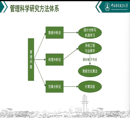 随后,讲座正式开始。首先,刘嘉老师简单介绍了管理科学研究方法体系,指出面对管理问题的三大方法:数据分析法、机理分析法以及仿真分析法。接着刘嘉老师对数据分析方法进行了详细的介绍,详细介绍了描述性统计、推断统计、聚类分析、因子分析、判别分析以及机器学习等具体的相关方法。然后刘嘉老师对机理分析法进行了详细的介绍,分别从数学规划(数学优化)、图与网络分析、典型决策问题三个方面进行详细的介绍。之后刘嘉老师对仿真分析方法也进行了详细的介绍。