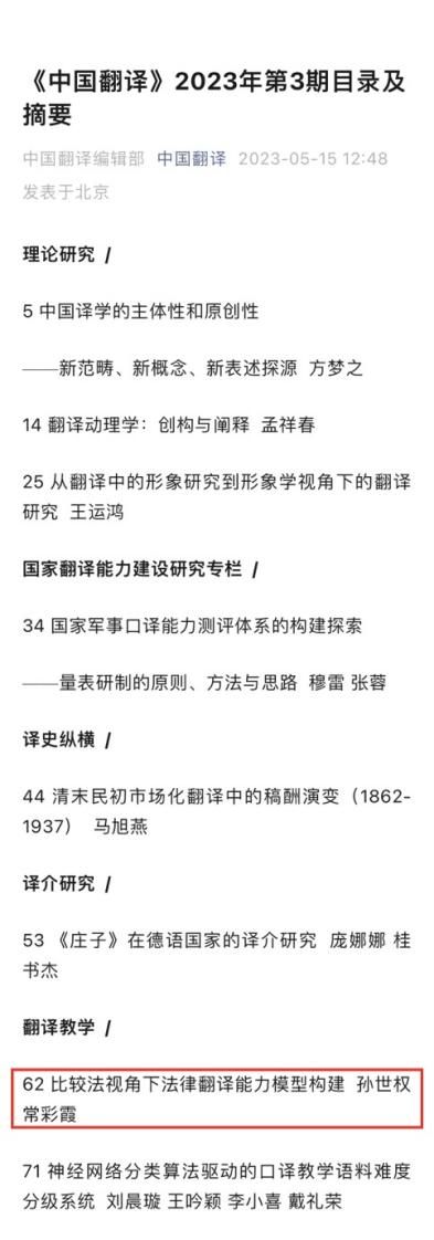 (通讯员 张冉)近日,外国语学院2021级法商笔译研究生常彩霞同学与导师孙世权副教授合撰的论文《比较法视角下法律翻译能力模型构建》在权威期刊《中国翻译》2023年第3期上发表?!吨泄搿?/span>是中国翻译协会会刊,被收录于CSSCI 中文社会科学引文索引(2021-2022)来源期刊、北京大学《中文核心期刊要目总览》来源期刊,是目前我国译界学术水平最高、最具权威性的期刊之一。