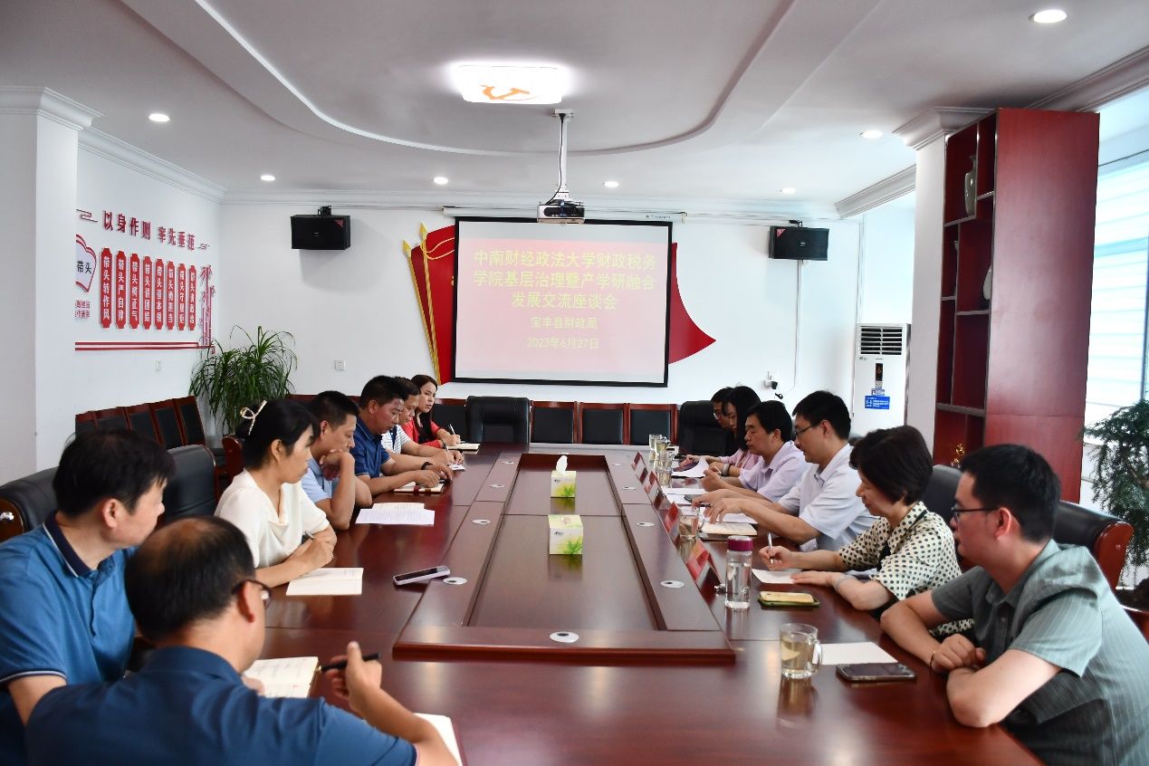 讲座结束后,实践队与来到县财政局开展基层治理暨产学研融合发展交流座谈会,县财政局副局长林帅锋、县委党史研究室主任郜现松及相关股室负责人参加了座谈会。首先,郜现松对宝丰县的红色历史以及与中南财经政法大学的深厚渊源进行了详细介绍,并对进一步加强双方产学研深度合作发表意见。林帅锋结合宝丰县财政具体情况,提出三个调研课题:一是地方政府专项债券资金使用情况、存在问题及对策;二是市县落实基层“三?!贝嬖谖侍饧岸圆?;三是加强财政绩效管理的典型做法及经验。针对上述调研课题,各股室负责人与调研组深度交流意见和看法,并对如何把问题吃透、问题摸准,提出针对性、操作性强的措施和对策开展研讨。