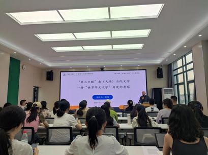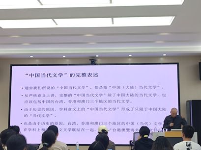 讲座伊始,刘俊教授分别从“(大陆)当代文学”和“世界华文文学”两个方面向同学们介绍了相关概念及其历史演变,进而引出主题—如何“看”(大陆)当代文学。他认为,“第一只眼”即新中国成立以来的前三十多年,主要是从当代(大陆)社会(政治)看(大陆)当代文学,而后四十多年的“第二只眼”是在此前的基础上,加入了一个从外国文学看(大陆)当代文学的视野。他从“世界华文文学”这“第三只眼”来观照(大陆)当代文学,从而发现一些用传统角度、位置、视野、立场难以发现的特点和问题。
