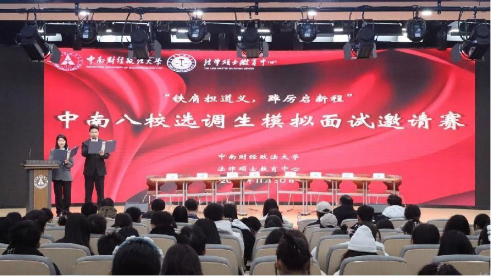 新闻网讯(通讯员 余安琪 学生通讯员 王济安)为深入学习贯彻党的二十大精神,深化同学们对公务员职业前景的认识、培养公考应试能力,法律硕士教育中心于11月30日下午在文济楼报告厅成功举办了“济世杯”系列就业指导活动之中南八校选调生模拟面试邀请赛。武汉大学法学院党委正处级副书记胡伟,华中师范大学法学院党委副书记兼纪检委员万枞,中国地质大学(武汉)公共管理学院党委副书记龚丽,我校法学院党委副书记兼法律硕士教育中心学生党总支书记易育,华中农业大学法学院辅导员艾俊,我校法律硕士教育中心辅导员余安琪、马晨娇和周诗琪,工商管理学院校友叶灵鹏,校外专家评委曾庆昊和李俊良参与本次邀请赛。