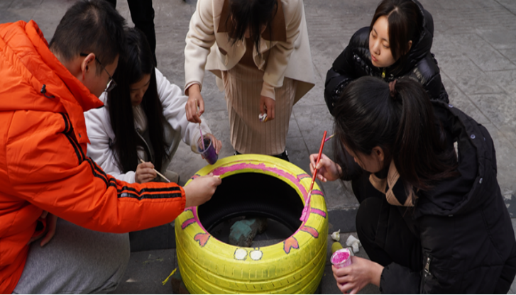 12月2日上午,法硕志愿者于太平社区开展“变废为宝”志愿活动。志愿者们逐一对由居民群众收集的废弃轮胎进行翻新上色,装饰小区周边道路。经过2个多小时的努力,四个别具一格的涂鸦轮胎诞生了。志愿者们用他们的巧手变废为宝,勾勒出青春色彩,为凛冽萧瑟的冬日街道增添了一抹靓丽的风景。改造后的废旧轮胎让归家的道路更加温馨,提升了居民的幸福感和归属感。