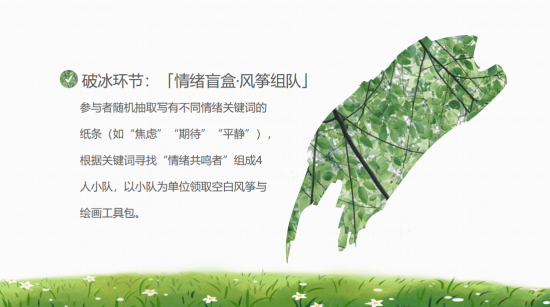 活动伊始,在破冰环节“情绪盲盒·风筝组队”中,主持人组织同学们随机抽取写有“焦虑”“惊讶”“平静”等情绪关键词的纸条。同学们依据抽到的关键词,迅速寻找有着相同情绪共鸣的伙伴,自行组成3人小队。组队完成后,各小队有序领取空白风筝与绘画工具包,为接下来的创作环节做好准备。