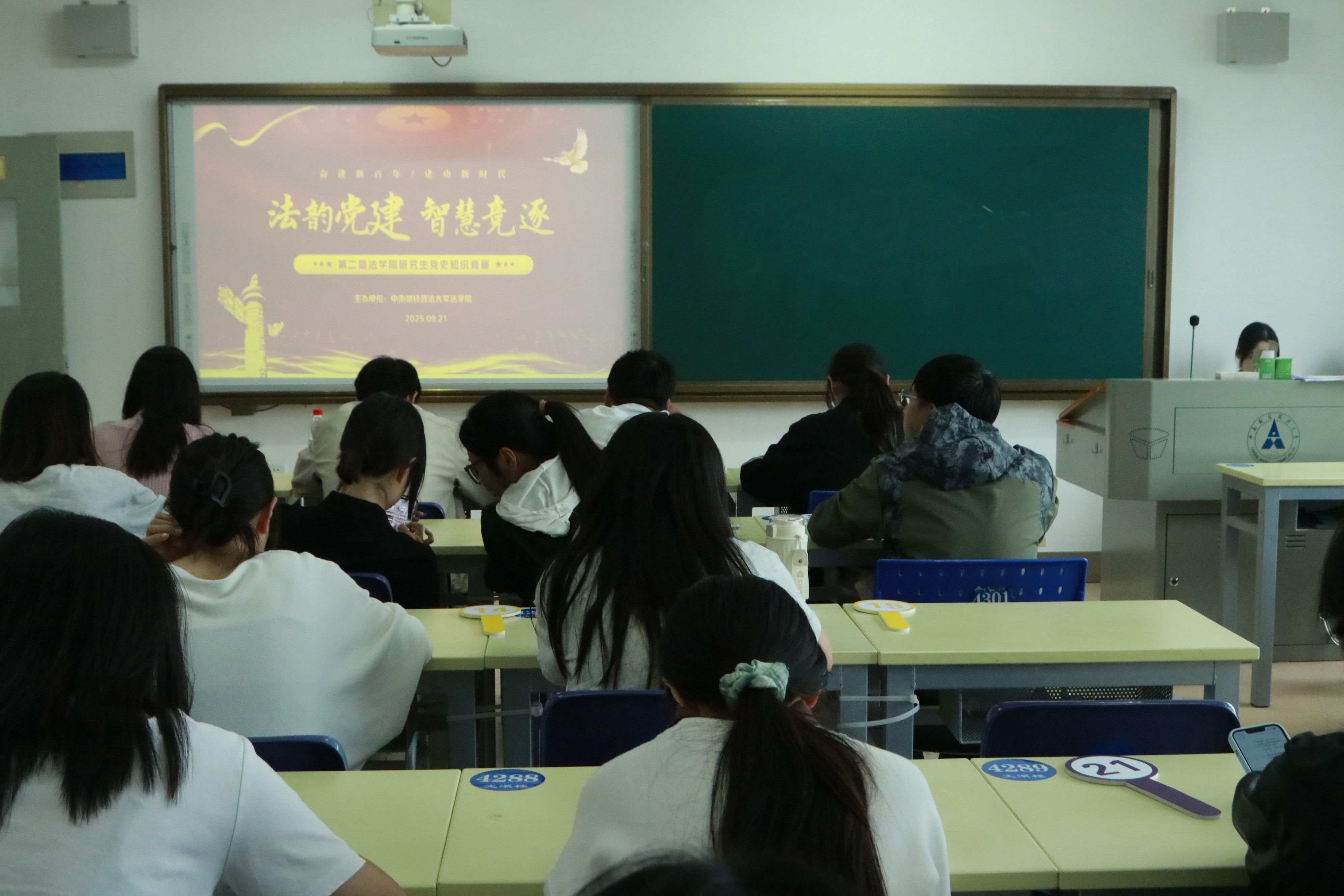 (通讯员 张秋蕊 宋嘉琪)为深入贯彻落实党中央关于推动党史学习教育常态化、长效化的精神,巩固拓展学习教育成果,引导广大法学青年从党的百年奋斗历程中汲取智慧力量、坚定理想信念,2025年9月21日15:00,由法学院研究生团总支与法言微语研究生网络思政育人工作室联合主办的第二届“法韵党建·智慧竞逐”研究生党史知识竞赛于文澴楼437教室举办。本次活动共吸引了法学院三十余名同学踊跃参与,在严肃活泼的竞赛氛围中深化了对党史的系统认识与理解,实现了以赛促学、以学促行的教育目标,参与同学也在学习交流中收获了成长。